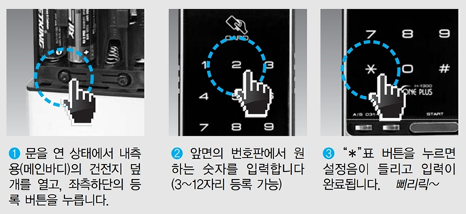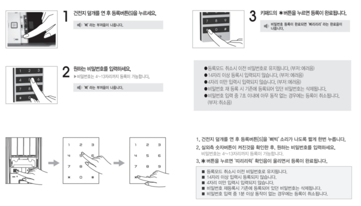 일단 가장 보편적인 방법은 등록버튼을 누르고 비밀번호 입력 > 다시 등록버튼 > 비밀번호 입력 > 별표입력입니다. 도어락 비번을 바꿨을 때 바로 문을 닫지 말고 제대로 적용이 됐는지 확인은 필수죠. 비밀번호 변경은 크게 어렵지 않습니다. 그럼 회사별 비밀번호 변경 방법을 살펴 보겠습니다.